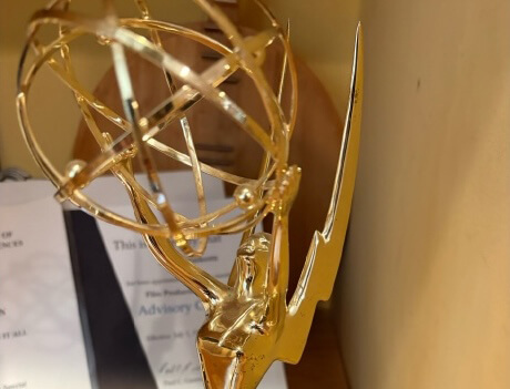 Emmy awards and film posters line the walls, signaling a long and impactful career in the entertainment industry. The accolades belong to Beth Fraikorn ’82, an executive producer, entrepreneur, and storyteller.